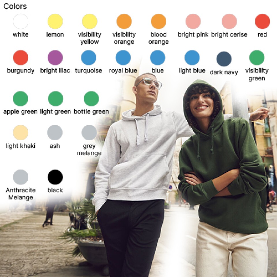 An unisex hooded sweatshirt. Flat cord drawstring at hood and pocket at front. Cuffs and hem in 1x1 rib with double stitching. An elastic cord inside the pocket to keep the cellphone in place.