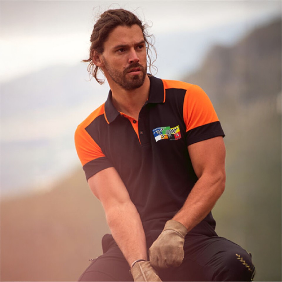 • Bicolour piqué with shorter placket and no buttons