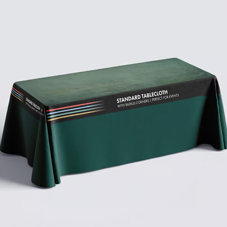 Achieve a seamless, professional look for any event with our full-coverage printed tablecloths. Designed to fit standard and custom table sizes, they drape elegantly to the floor, concealing clutter and creating a polished, unified appearance. Made from durable, easy-care stretch polyester, they feature all-over, high-definition dye-sublimation printing that wraps around edges without seams, ensuring your logo and graphics are displayed with vibrant, fade-resistant clarity. Essential for trade shows, banquet halls, product launches, and retail displays, a custom tablecloth is the most effective way to claim your space and make a powerful, lasting brand impression.