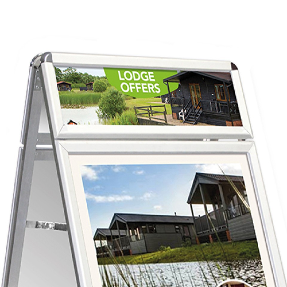 Maximize your impact with the A-Master Plus A-frame sign. It features a double-sided A1 main display plus an additional snapframe header for extra promotional space. Built with front-opening aluminium snapframes and a stable galvanised steel base, it's both durable and practical. Anti-glare, UV-stable covers protect your graphics. Designed for convenience, it folds flat for storage and is ideal for indoor or sheltered outdoor use.